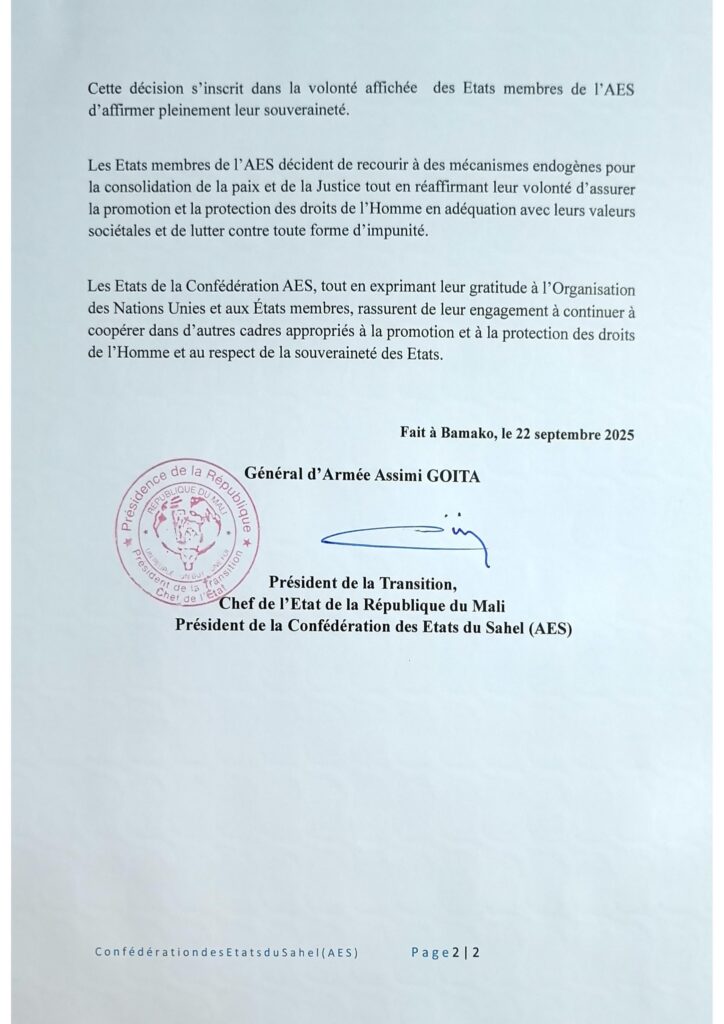 Les Etats de la Confédération AES, tout en exprimant leur gratitude à l’Organisation des Nations Unies et aux États membres, rassurent de leur engagement à continuer à coopérer dans d’autres cadres appropriés à la promotion et à la protection des droits de l’Homme et au respect de la souveraineté des Etats.